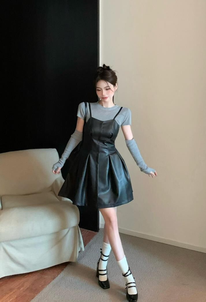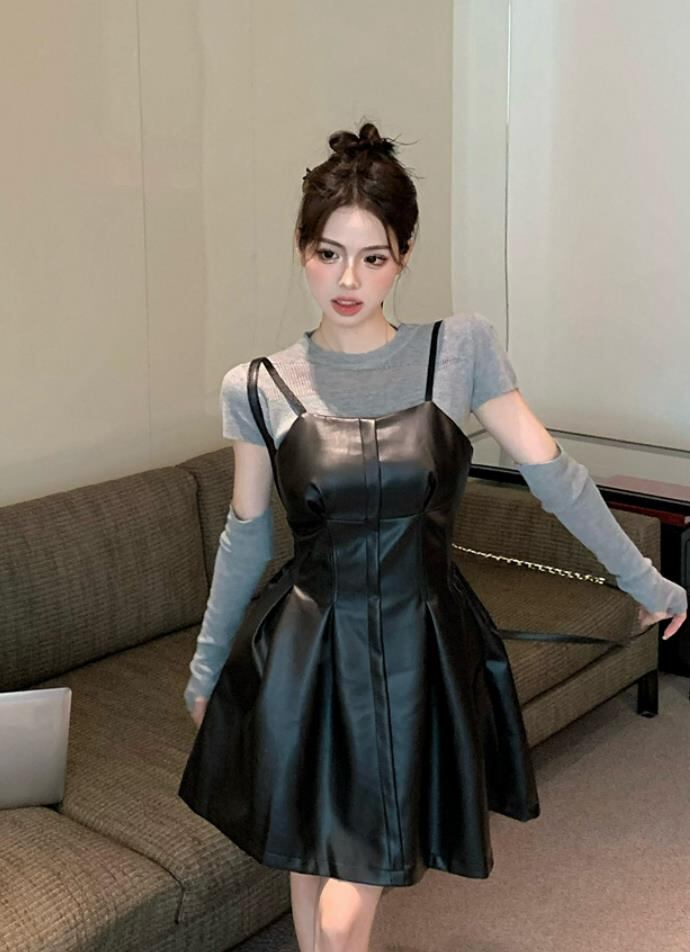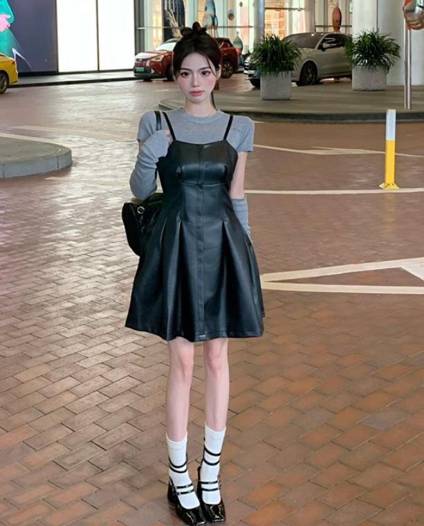 秋冬新作 女 レディース 袖なし PU 吊りスカート ミニ ワンピース ドレス 台型スカート セット