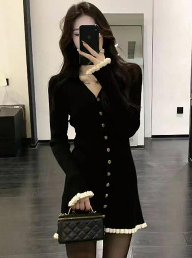 2025秋冬新作 女 レディース ハイウエスト 長袖 ニット ミニ ワンピース ドレス タイトスカート