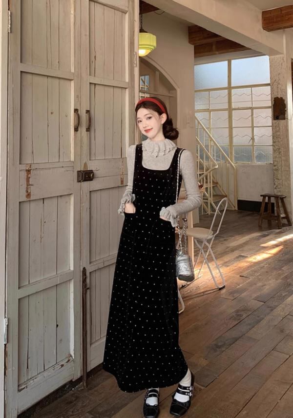 2025秋冬新作 女 レディース ハイウエスト 袖なし ベロア ロング ワンピース 台型スカート セット