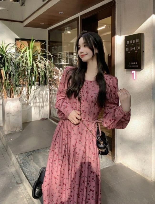 2025秋冬新作 女 レディース 長袖 花柄 コールテン ロング ワンピース 台型スカート