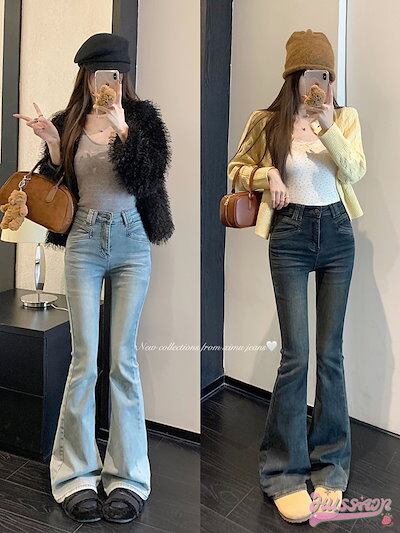 2024 春夏パンツ デニム ジーンズ スキニー ワイドレッグ ハイウエスト 脚長効果 美脚効果 細見え 春 水色 ライトブルー グレー カジュアル 韓国ファッション レディース お出かけ