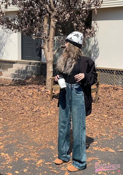 パンツ デニム ジーンズ モップパンツ ステッチ ワイド ストレート ハイウエスト 脚長効果 美脚効果 細見え 春 カジュアル 韓国ファッション レディース お出かけ