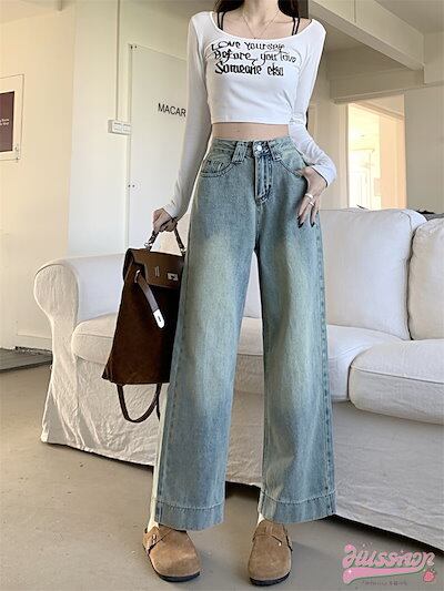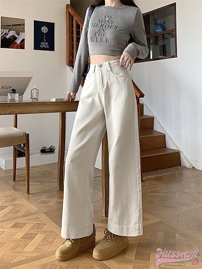 パンツ デニム ジーンズ ワイド ストレート ハイウエスト 脚長効果 美脚効果 細見え ウォッシュ加工 春 白 カジュアル 韓国ファッション レディース お出かけ