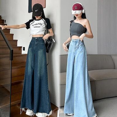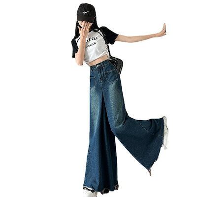 デニムボトムス ジーンズ ワイドパンツ レディース 港風 レトロおしゃれ 着痩せ ジーンズ ロングパンツ レディース服 デザイン感 ハイウェストゆったり 長ズボン ロングズボン ワイドパンツ