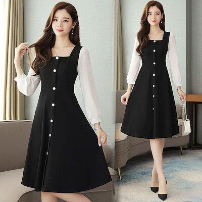 ワンピース レディース ワンピース 秋 きれいめ 膝丈ワンピース aラインドレス 着痩せ 通勤 結婚式ドレス お出かけ 長袖 スクエアネックワンピース