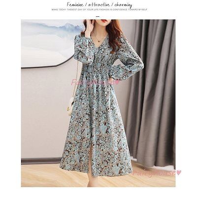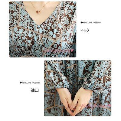 ワンピース レディース 40代 きれいめ マキシワンピース 春夏 長袖ワンピース 花柄パフスリーブ Vネック aラインスカート オシャレ韓国風 大人 通勤OL ゆったり
