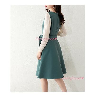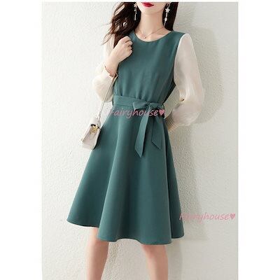 ワンピース レディース きれいめ 膝丈ワンピース 春秋 長袖ワンピースパフスリーブ リボン Aラインスカートフェイクレイヤード オシャレ大人 着痩せドレス