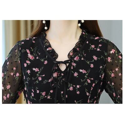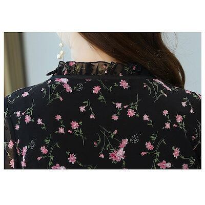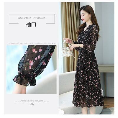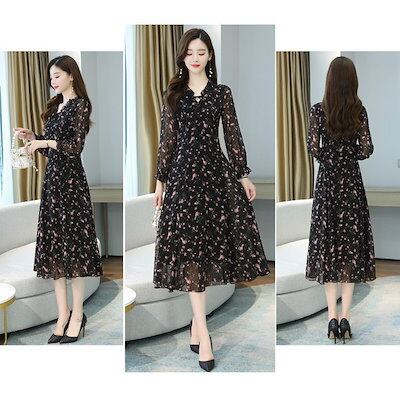 ワンピース レディース きれいめ マキシワンピース 秋冬 長袖ワンピース 花柄シフォン リボンVネック Aラインスカート オシャレ大人 結婚式ドレス