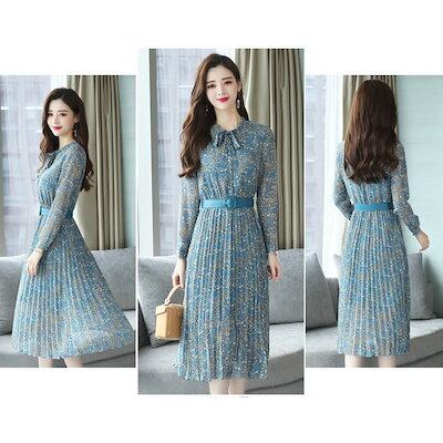 ワンピース レディースきれいめ 膝丈ワンピース 秋冬 長袖ワンピース 花柄シフォン リボンネック aラインスカート オシャレ大人 結婚式ドレスワンピース レディースきれいめ 膝丈ワンピース 秋冬 長袖