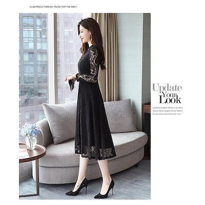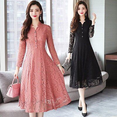 ワンピース レディース 40代 きれいめ マキシワンピース レース Vネック Aラインスカート 春秋 長袖ワンピース オシャレ大人 レース 結婚式ドレス 30代 50代