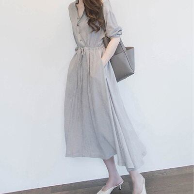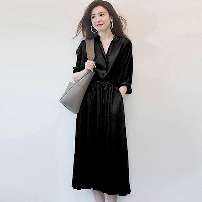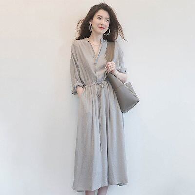 ワンピース レディース ロング丈 マキシ リネン ベルト お洒落 Aライン Vネック チュニック 長袖 無地 着痩せ きれいめ ゆったり 大きいサイズ