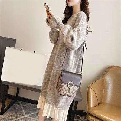 新作 セール ニットワンピース ロング レディース 膝丈 セーター レイヤード風 ワンピース ニット ニットウェア 長袖 秋冬 Aライン 体型カバー 切り替え