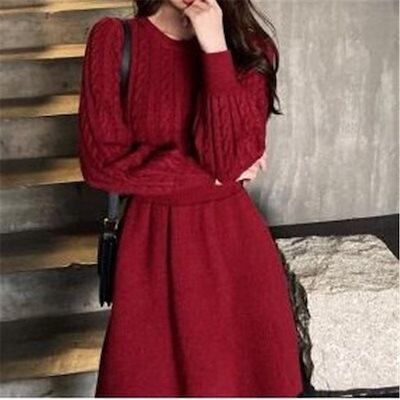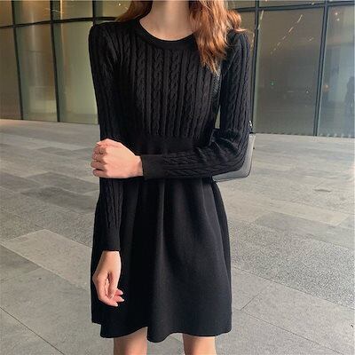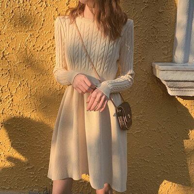 ニットワンピース レディース クルーネック フレア リブ 膝丈 ひざ丈 Aライン きれいめ 秋冬 長袖 ワンピース 体型カバー セーター おしゃれ