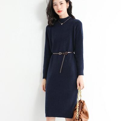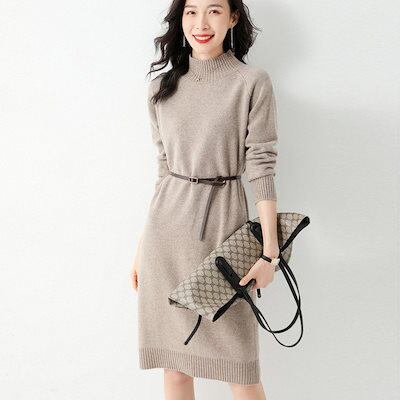 ニットワンピース レディース プチハイネック フレア 膝丈 ひざ丈 Aライン きれいめ 通勤 秋冬 長袖 ワンピース 体型カバー セーター おしゃれ