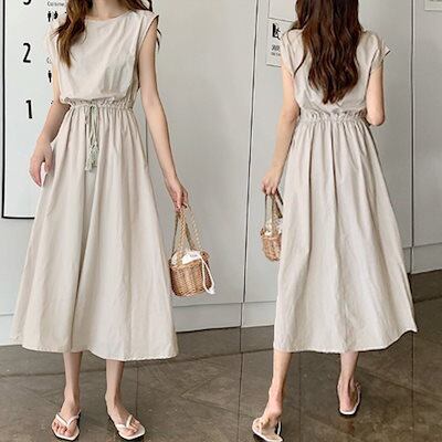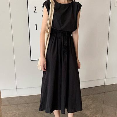 リネンワンピース レディース ウエストゴム チェック柄 ロングワンピース ウエストシャーリング Aラインワンピース ノースリーブ