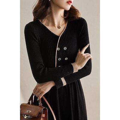 ニットワンピース レディース 40代 秋冬 長袖ワンピース 黒vネック aラインスカート ロング丈 ニットインナー 大人上品 オシャレ韓国風 ゆったり 30代 50代