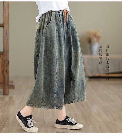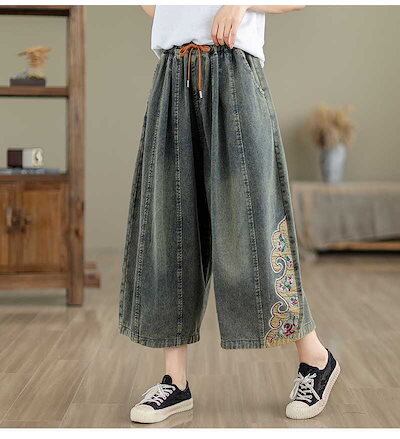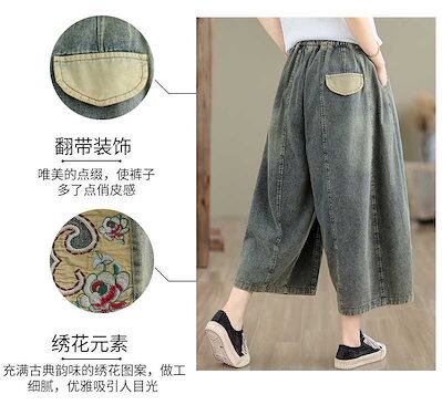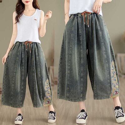 「ファットガール」 八分丈 デニムパンツ 刺繍 ワイドパンツ ゴム 体型カバー 大きいサイズ ゆったり レディース 福袋