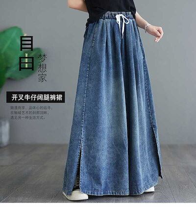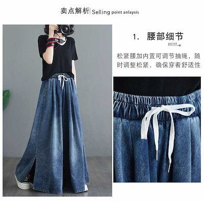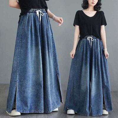「ファットガール」 デニム ワイドパンツ キュロットスカート スリット ゴム ハイウエスト 体型カバー 大きいサイズ ゆったり レディース 福袋