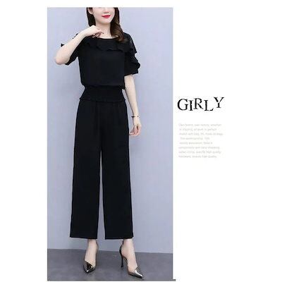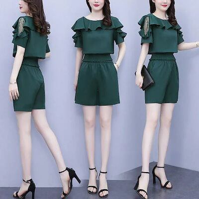 着痩せ オシャレ セットアップ 【2点セット】涼しく楽ちん レディース ワイドパンツ 半袖 カジュアル 通勤ハイウエストショーツ2点セット レース 大きいサイズ 40代 韓国風