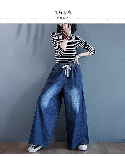 「ファットガール」 秋冬 デニムパンツ ゴム ワイドパンツ ハイウエスト 大きいサイズ ゆったり フレア レディース ロングパンツ