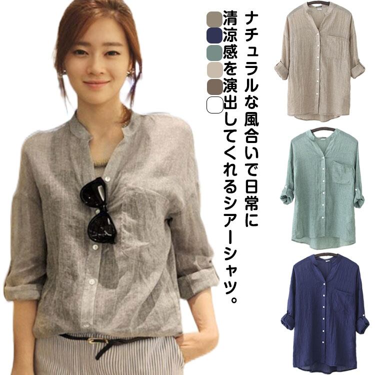 シャツ 綿 麻 シアーシャツ レディース 長袖 ライトアウター ポケット 羽織り ボタン