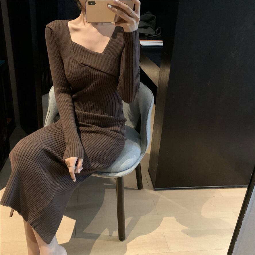 ins超人気 ★ 韓国系 高級感 フェミニン 切り替え Aライン Vネック 無地 ニットワンピース
