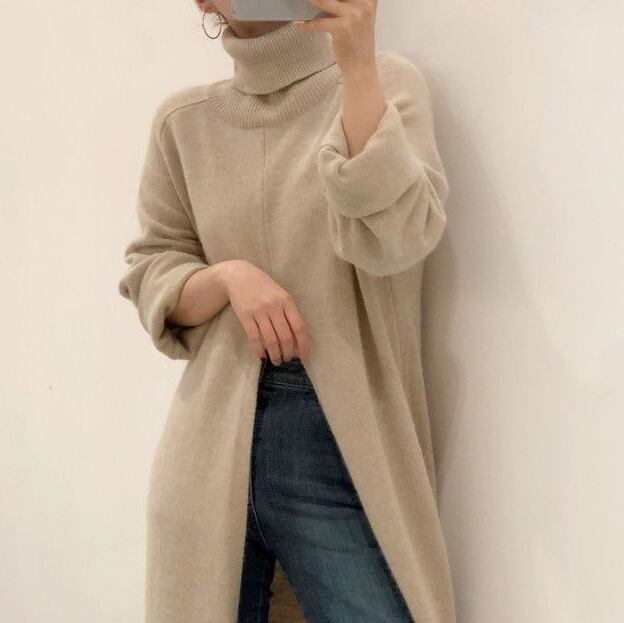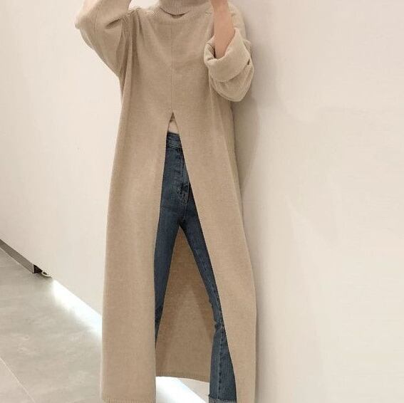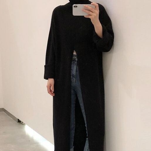 ins超人気 ★今季も大流行 ファッション オリジナル 無地 ハイネック ススリット ニットワンピース