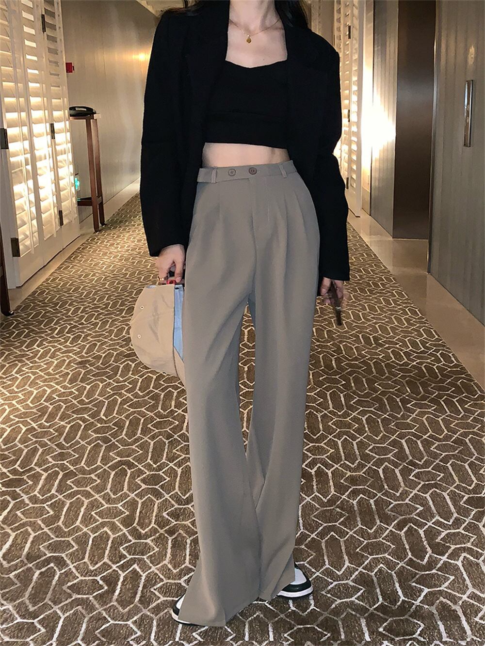 ins超人気 ★韓国風人気シンプルベルトハイウエスト快適スーツカジュアルワイドレッグスーツパンツ