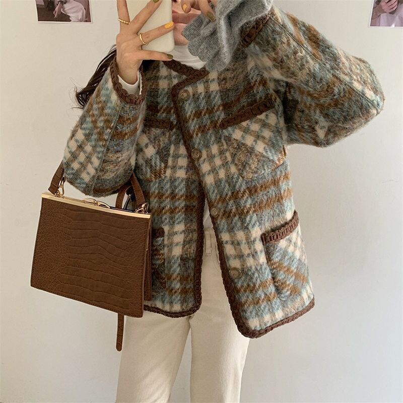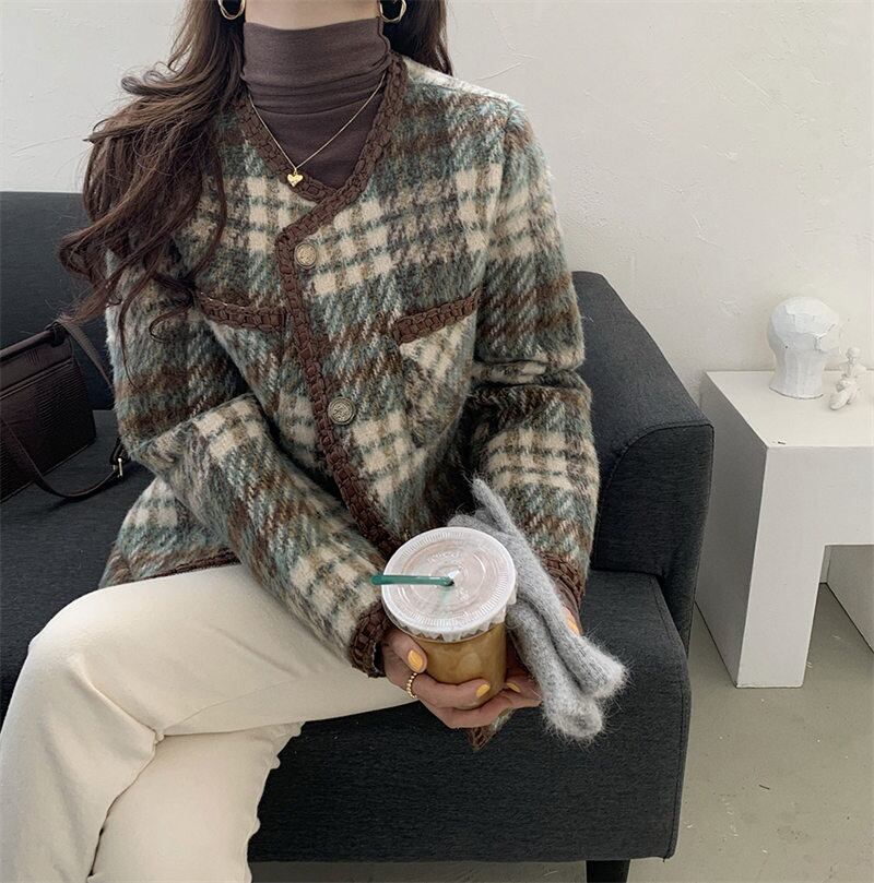 レトロ ラウンドネック チェック柄 シングルブレスト 裏起毛 カーディガン