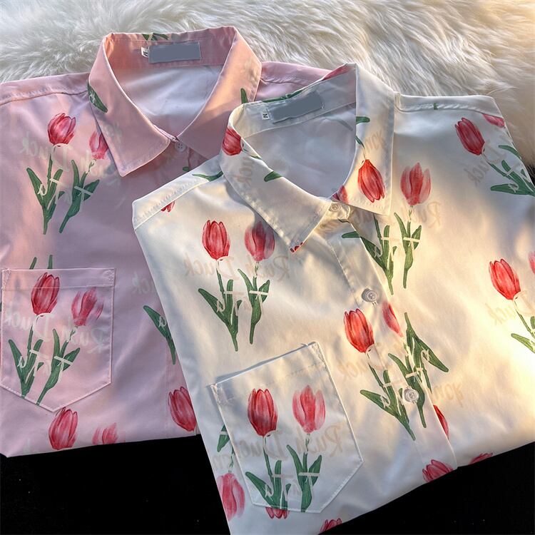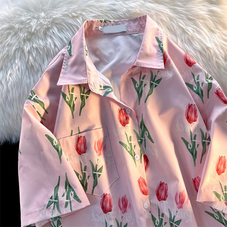 夏 カップル トップス 気質 お出かけ チューリップ 半袖 フラワーシャツ