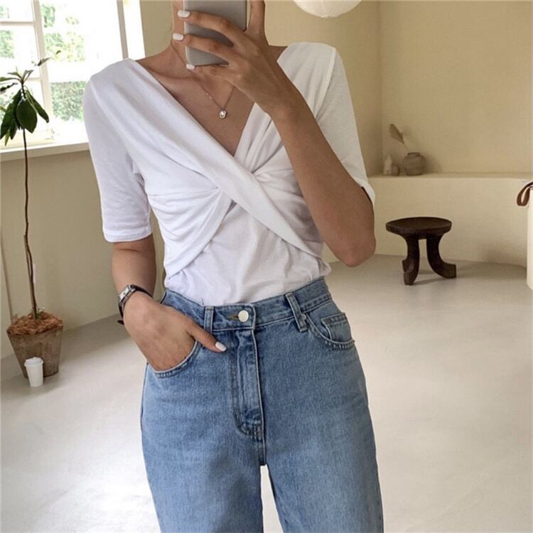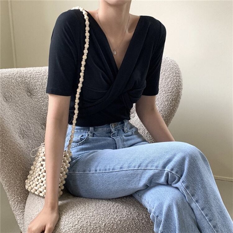 2022AW新品早割 レトロ 交差する Vネック スリム 半袖 Tシャツ トップス シンプル