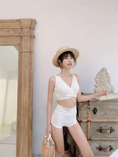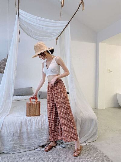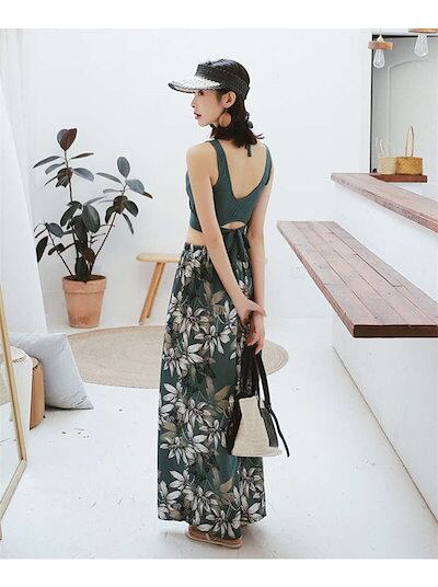 水着 レディース 体型カバー タンキニ Vネック ワイドパンツ 3点セットママ水着 ロングパンツ バックシャン カシュクール風 可愛い お洒落 エスニック柄 ボタニカル オトナ女子 上下別 かわいい