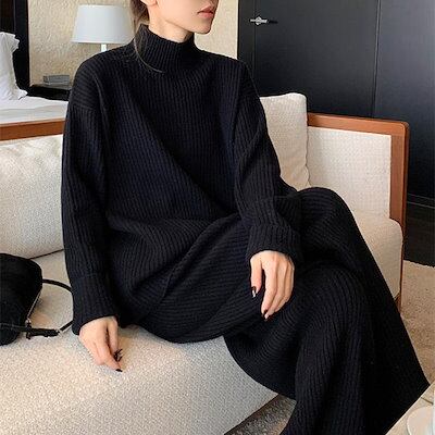セットアップ レディース 秋冬 リブニット 上下セット パンツ セーター プチハイネック 長袖 ゆったり 無地 厚手 プルオーバー ワイドパンツ ウエストゴム ニットセットアップ 可愛い お洒落 カジ