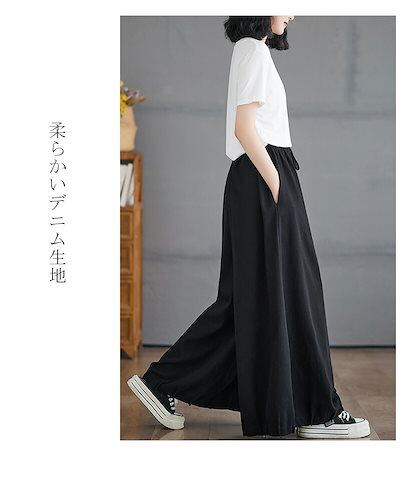 ワイドパンツ デニム レディース ジーンズ ジーパン パンツ ボトムス ボリューム ワイドルーズ ストレート ハイウエスト ゴム ロング丈 長め 大きいサイズ 無地 可愛い 森ガール 上品 ゆったり