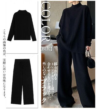 ニットセットアップ レディース パンツセットアップ 秋冬 上下セット タートルネック 長袖 ゆったり 無地 厚手 プルオーバー ワイドパンツ ウエストゴム ニットセットアップ 可愛い お洒落 カジュア