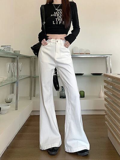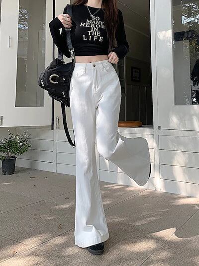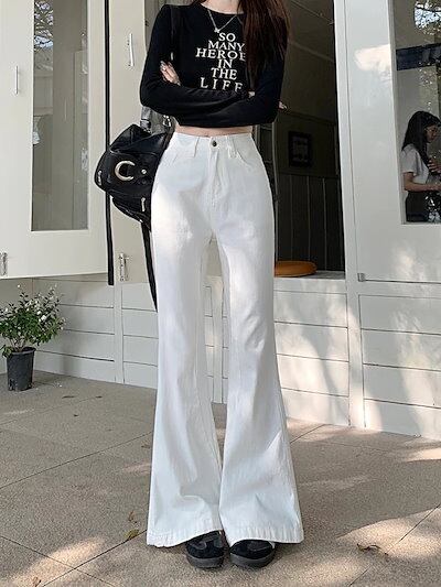 25パンツ デニム ジーンズ ワイド ストレート ハイウエスト 脚長効果 美脚効果 細見え 白 ホワイト カジュアル おしゃれ かわいい シンプル 韓国ファッション レディース お出かけ