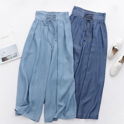 天糸デニムスカンツ薄手プリーツスカートスカーチョ ガウチョパンツ ガウチョ ワイドパンツ レディース デニムパンツウエストゴム シンプル きれいめ /ゆったり天糸デニム広い足のズボンはぶら下が スラッ