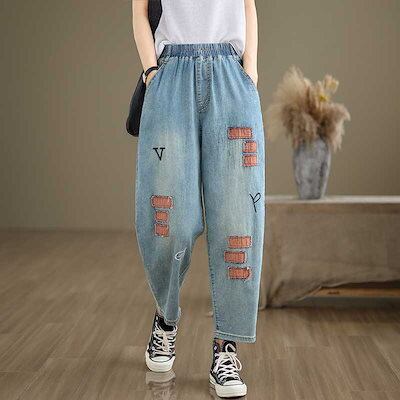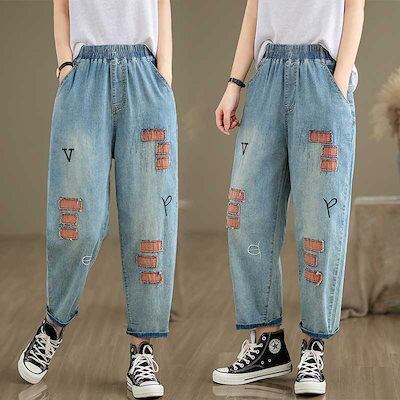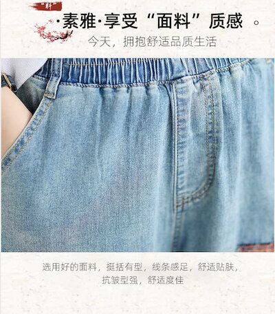 「ファットガール」 夏 薄手 ジーンズ 刺繍柄 デニムパンツ ゴム 八文丈 レディース ワイドパンツ スラックス 体型カバー 大きいサイズ ゆったり