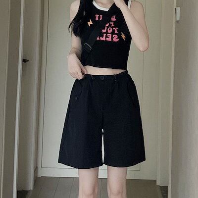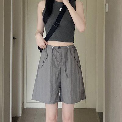 接触冷感ボトムスワークショーツ レディース 夏 薄手 ハイウエスト カジュアル ワイドデザイン センス 速乾 スポーツ アメリカン 5分丈パンツ
