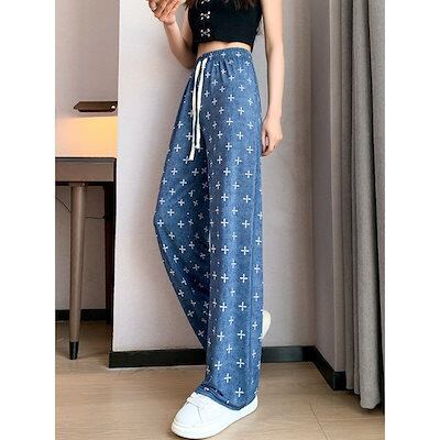 【人気新作】 涼感ワイドパンツ デニム調 接触冷感 ロング クール 涼しい大きめサイズ 夏用 美脚ストレッチ ゆったり 薄手 体型カバー ウエストゴム ボトムス 着痩せ