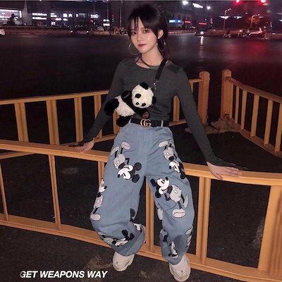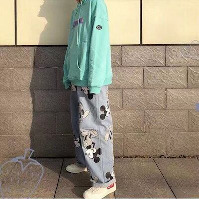 2024年 韓国 ミッキーマウス 漫画 プリント ライトカラー メンズ レディース ルーズ ハイウエスト ストレート ワイドレッグ カジュアル ジーンズ ジーンズ