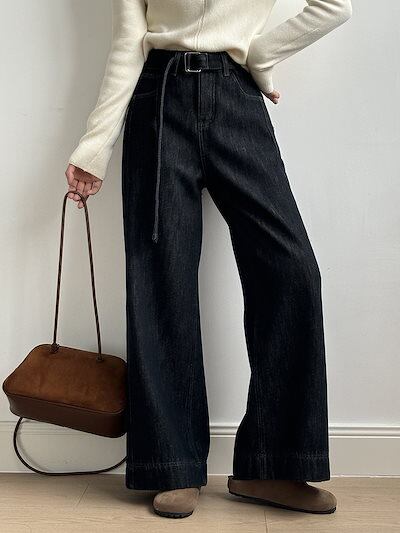 暖かい パッド入り ストレートジーンズ レディース 2024 冬 ハイウエスト カジュアル ワイドパンツ ベルト付き