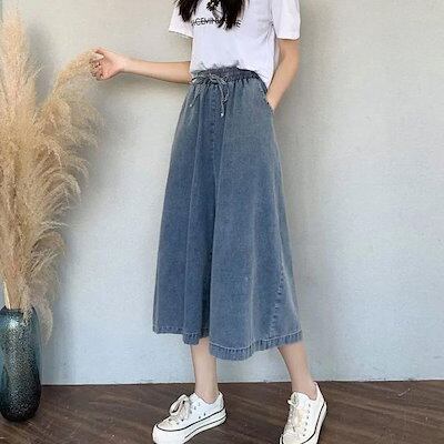 ガウチョパンツ七分丈デニムパンツデニムガウチョパンツレディーlスワイドパンツスカーチョデニムパンツキュロットパンツフレアパンツウエストゴム薄綿混スカーチョMLXL2XL3XL4XL5XL