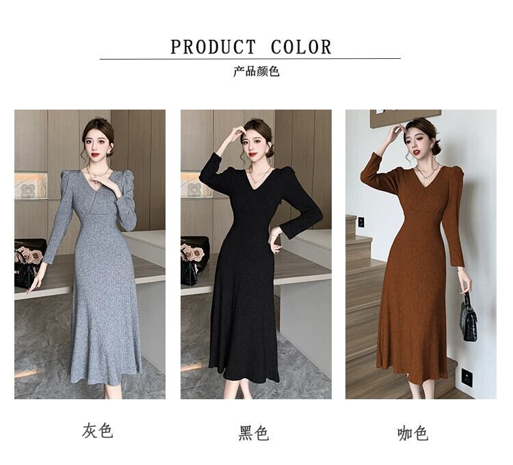 2024 春と秋のレトロパフスリーブ V ネックミッドレングス膝上肥厚カシミアドレススリムフィット女性 スプリング 春物 オータム 秋物 Vネック ワンピース スカート kita87012220126a13357419064