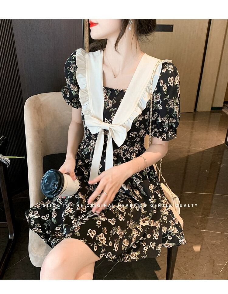 2024 夏の新スタイルフレンチネイビーカラーリボン黒花柄ドレス女性のハイウエスト痩身スカート ハイウェスト ブラック サマー 夏物 ワンピース スカート kita87012220126a6113498950