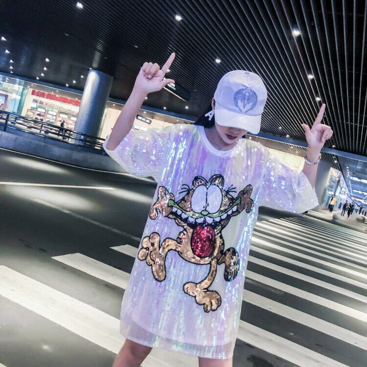 光沢のあるドレスの女性の夏 2023 新しい漫画猫重工業スパンコールルーズ半袖 tシャツ女性トレンディな サマー 夏物 トップス パンツ ブラウス kita87012220206b72163038462