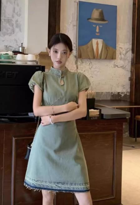 春夏新作 女 レディース ハイウエスト 半袖 デニム ミニ ワンピース ドレス 台型スカート S-L VFH36954