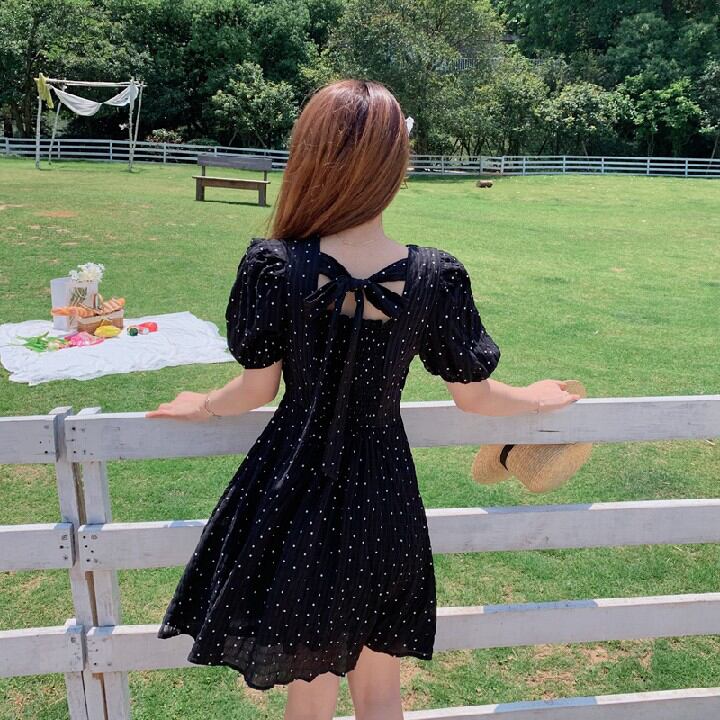 ウエスト半袖ワンピースパフスリーブVネック水玉ショート FGN2369