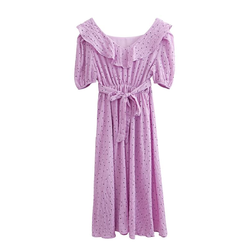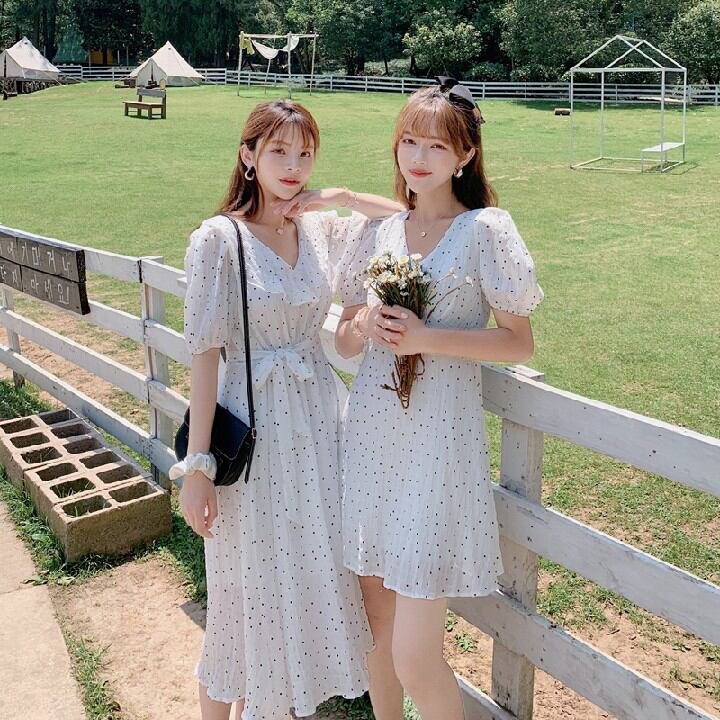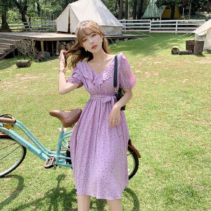 ウエスト半袖ワンピースパフスリーブVネック水玉ショート FGN2369aa