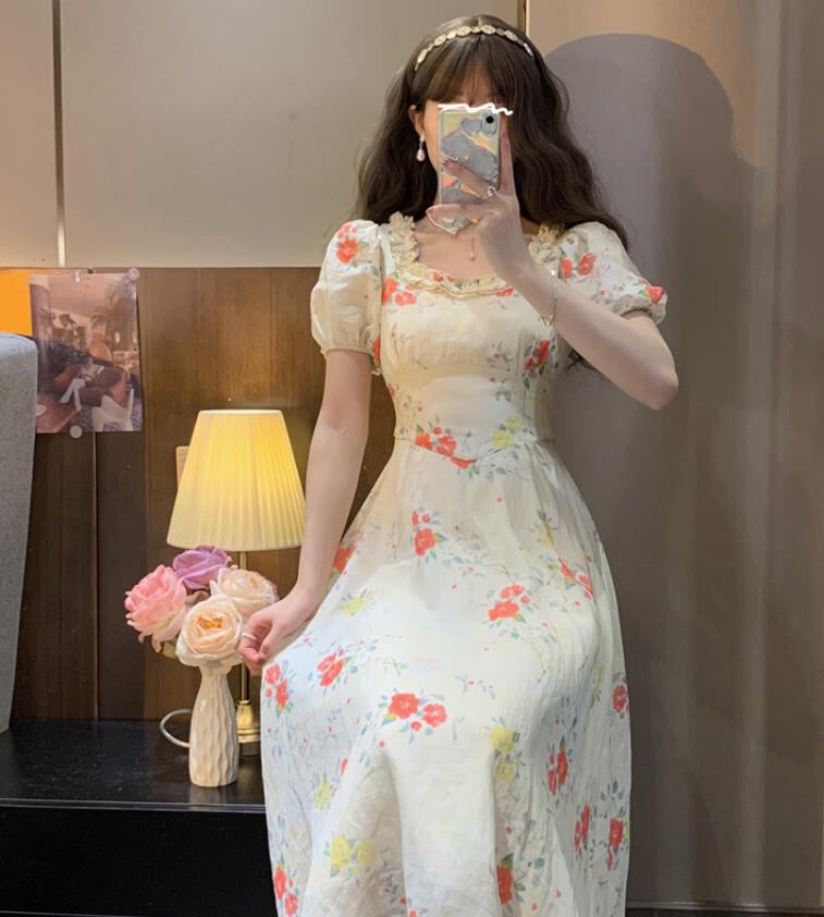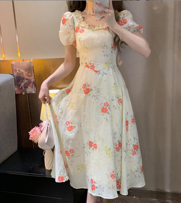 春夏新作 女 レディース ハイウエスト 半袖 花柄 パフスリーブ ロング ワンピース 台型スカートEERMJNB3697012